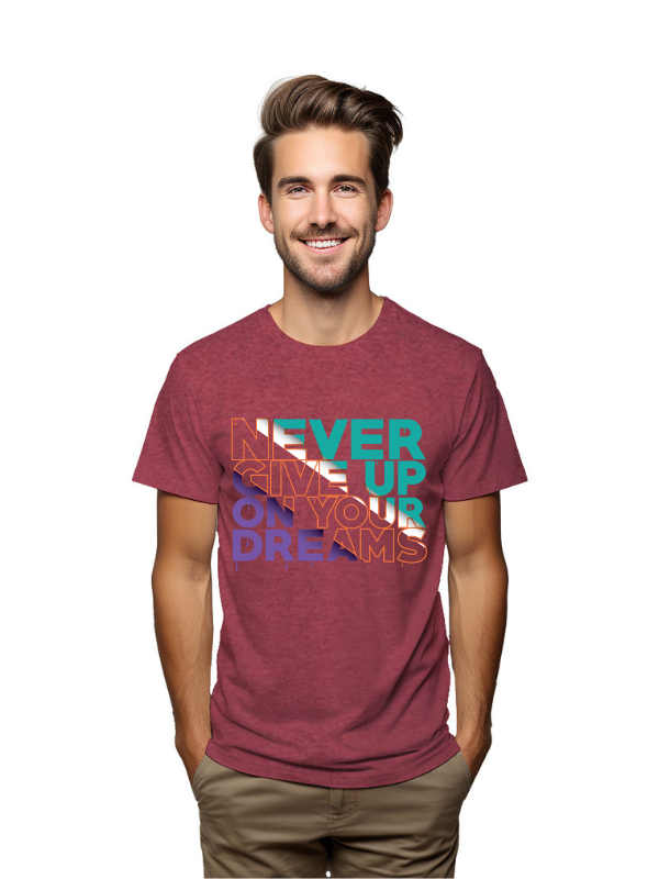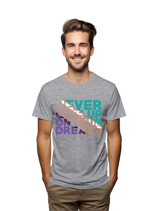 Elevate your wardrobe with this Never Give Up On Your Dreams Motivational T-Shirt. Designed for dreamers and achievers, this high-quality charcoal tee inspires positivity and perseverance every time its worn.